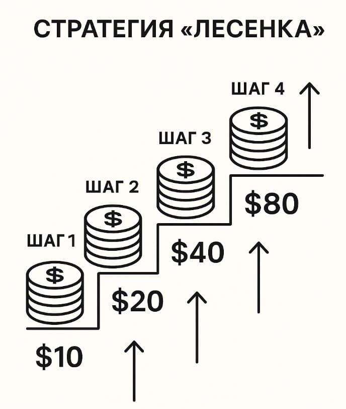 «Лесенка» - это стратегия, при которой беттор составляет цепочку из нескольких независимых ставок (обычно от 3 до 7). Каждая последующая ставка делается на часть или всю прибыль, полученную от предыдущих выигрышей. Цель — начав с небольшой суммы, многократно приумножить ее к финалу серии.