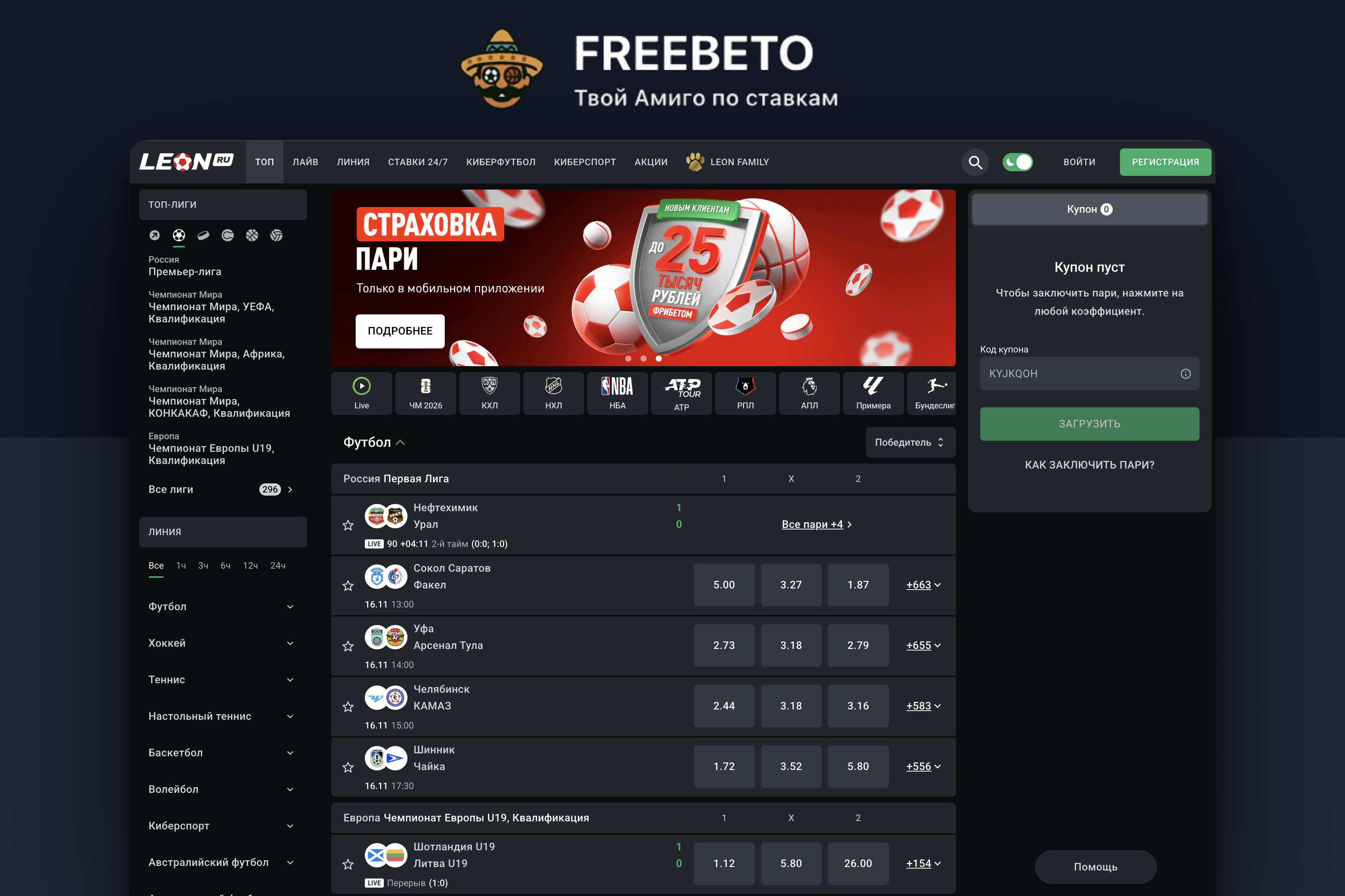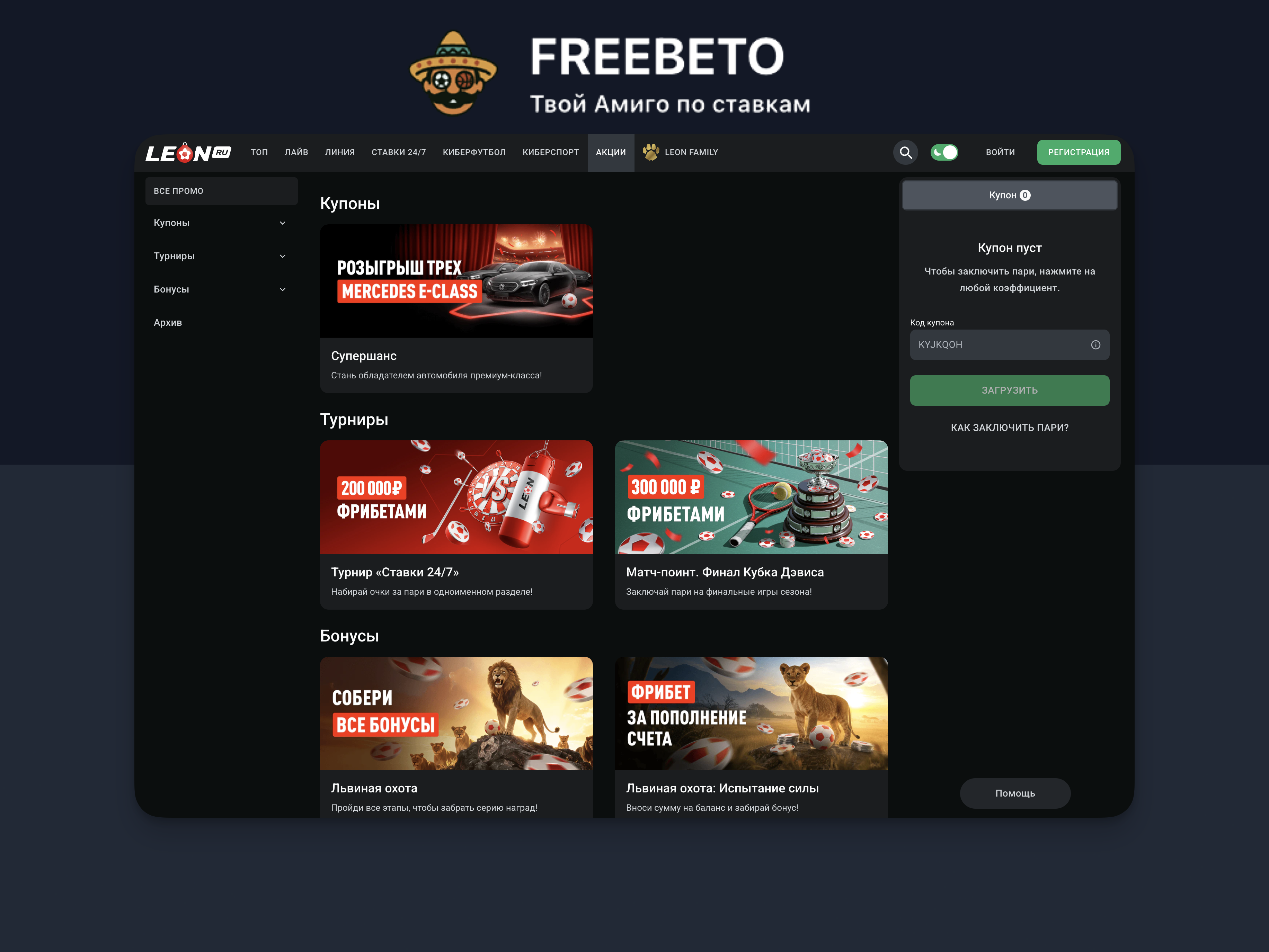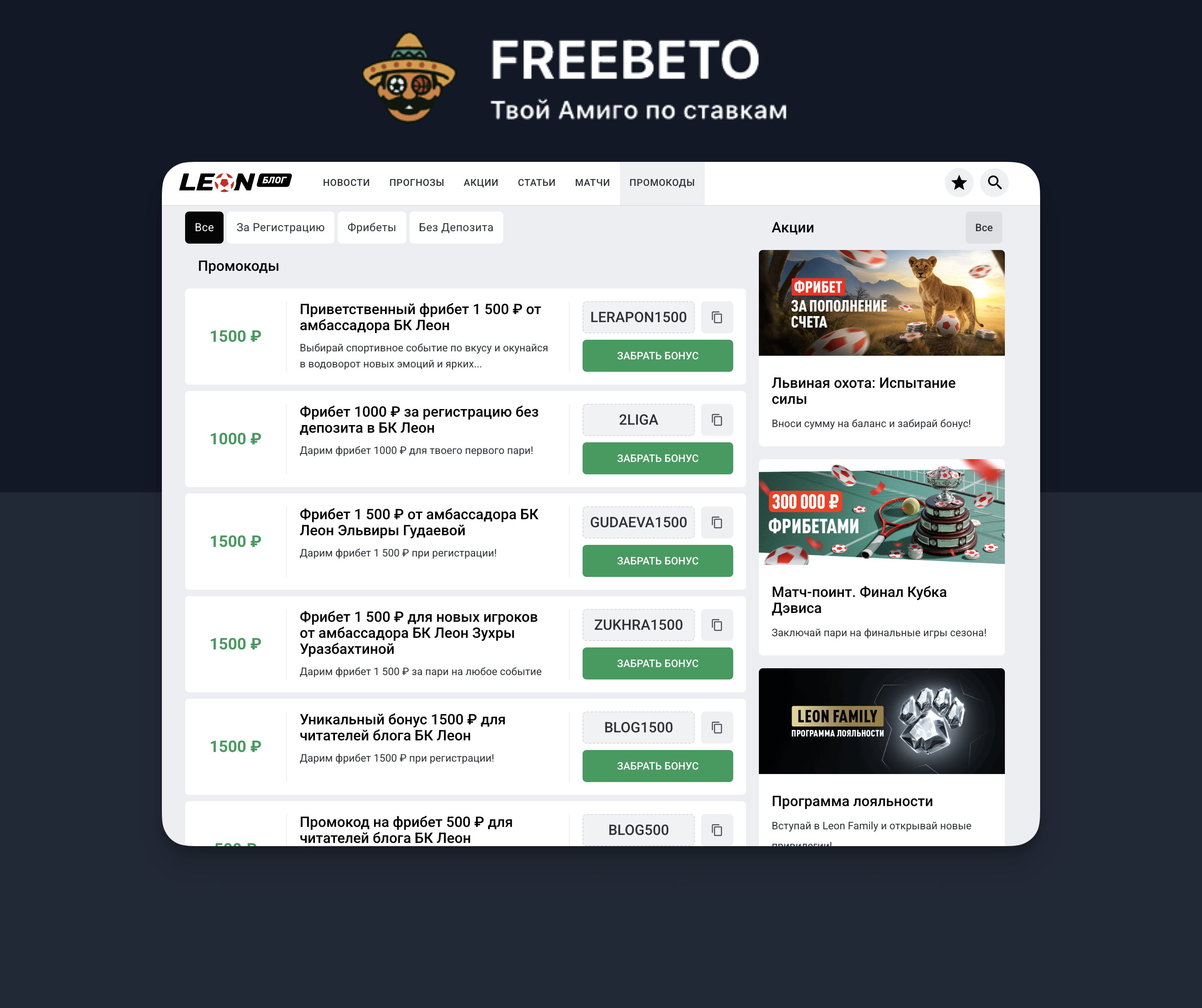 👉 Все актуальные бонусы собраны здесь: Все фрибеты БК Леон